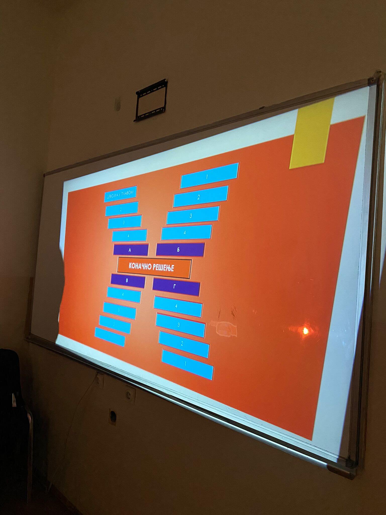 Na samom početku učenici su upoznati sa pravilima. Predstavljeno im je šta se od njih očekuje i na koji način će aktivnosti biti realizovane. Potom su podeljeni u grupe u skladu sa tim koja im nastavnica drži nastavu. Ovo je doprinelo dodatnoj motivaciji. Cilj nam je bio da podstaknemo razvoj timskog duha i međusobnu saradnju. Ovo je bila prilika i da učenici razmene svoja znanja. Tokom celog časa bilo je vrlo neizvesno i dinamično. Na kraju je jedna grupa ipak pokazala prednost u odnosu na drugu.
